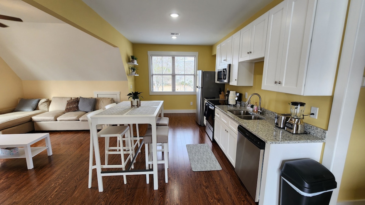 Notre espace est confortable, propre et équipé avec ce dont vous avez besoin pour profiter de Greenville. Il comprend un lit King Size confortable et un coin salon en plus d'une petite cuisine. Un réfrigérateur compact, un petit four et un micro-ondes sont à votre disposition. C'est un espace lumineux en journée, mais les lumières sont sur des variateurs pour créer une ambiance douce en soirée. Le quartier est éclectique mais calme et sûr. Vous ne serez pas déçu !