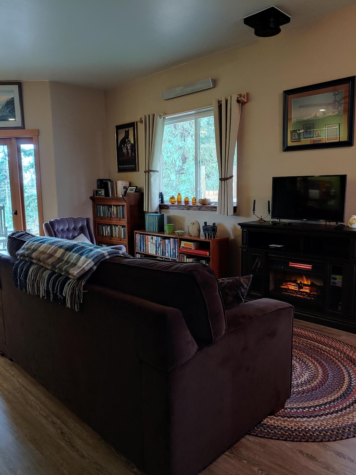 Maison confortable et calme de 900 pieds carrés, 1 chambre, 1 salle de bain, pas d'escaliers. Située sur 10 acres boisés surplombant Holmes Harbor. À 15 minutes à pied du centre-ville de Freeland et à 5 minutes en voiture de la plage de Double Bluff. Une cour arrière clôturée avec patio est un endroit idéal pour déguster une tasse de café ou un verre de vin, tout en observant la faune. Cuisine bien équipée pour ceux qui aiment cuisiner. Accessible en fauteuil roulant partout. À dix miles du ferry de Clinton. Venez vous détendre et vous ressourcer à High Ground. WiFi en streaming uniquement.