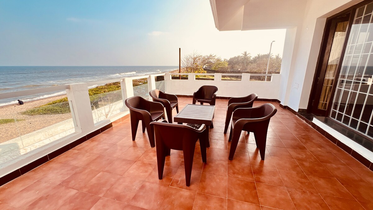 Stunning beachfront, where golden sands meet waves view from your private balcony with panoramic ocean views, and view of sunrise. NOTE- THIS PROPERTY DOES NOT HAVE POWER BACKUP This beachfront villa offers 2 bedrooms, each with attached bathrooms. • Both are fully air-conditioned with queen-size beds. • Note: Only one bathroom has a water heater. The kitchen includes an induction stove and basic utensils—perfect for heating meals. Swiggy and Zomato deliver right to the area.