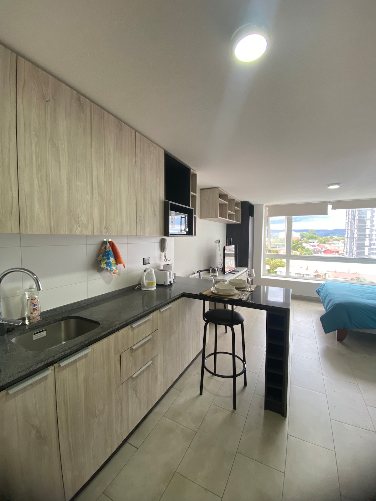 Profitez du confort et du style dans cet appartement entièrement équipé, stratégiquement situé avec accès à Av. Picarte et Costanera, à seulement quelques minutes du centre de Valdivia. - Salon-salle à manger. - Cuisine entièrement équipée : four électrique, hotte, micro-ondes, lave-vaisselle, réfrigérateur, bouilloire, grille pain, cafetière et mixeur. - Salle de bain avec thermos électrique, fer à repasser, sèche-cheveux et serviettes. - Chambre avec lit 2 places. - Terrasse. - Wifi 800mbps - Parking couvert à l'intérieur de l'immeuble.