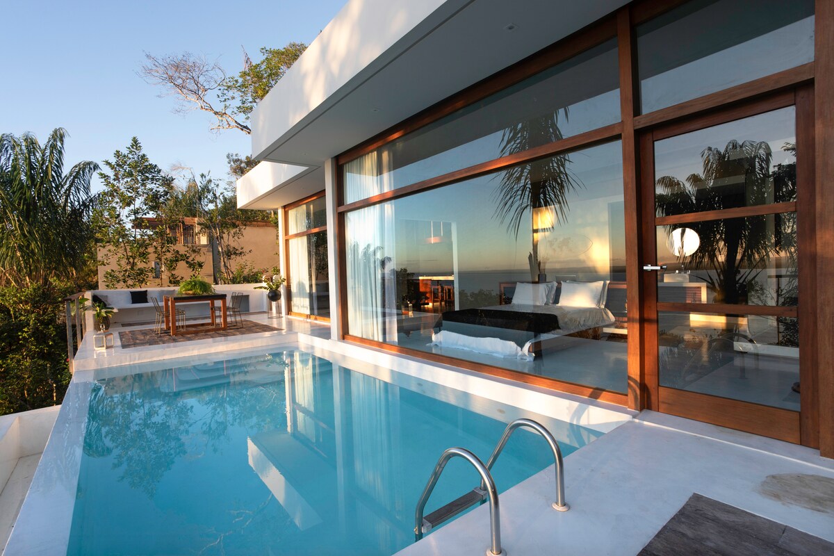 Suite avec cuisine vue sur la piscine au coucher du soleil
