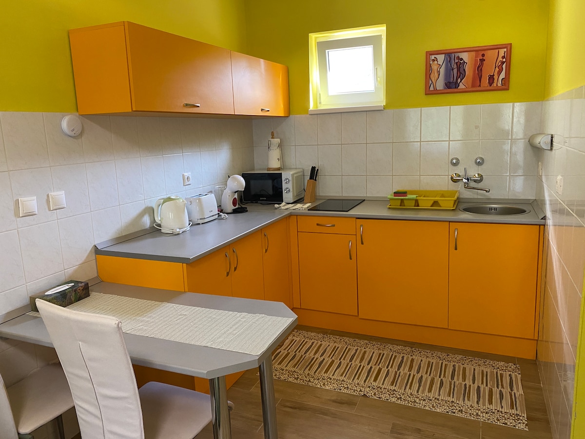 **** (hébergement 4*) Cet appartement paisible, neuf, très moderne et élégant, situé au centre, peut accueillir 2 à 3 personnes. À quelques minutes des commerces, de la boulangerie, du bureau de poste, des cafés et des restaurants. 150 m - Rue piétonne 550 m - Lac thermal de Héviz L'appartement dispose d'une chambre et d'un salon cuisine avec télévision et canapé Un parking gratuit est disponible à l'avant du bâtiment. Il est si proche du lac que vous n'aurez pas besoin d'utiliser votre voiture du tout :) L'appartement ne convient pas aux moins de 2 ans.