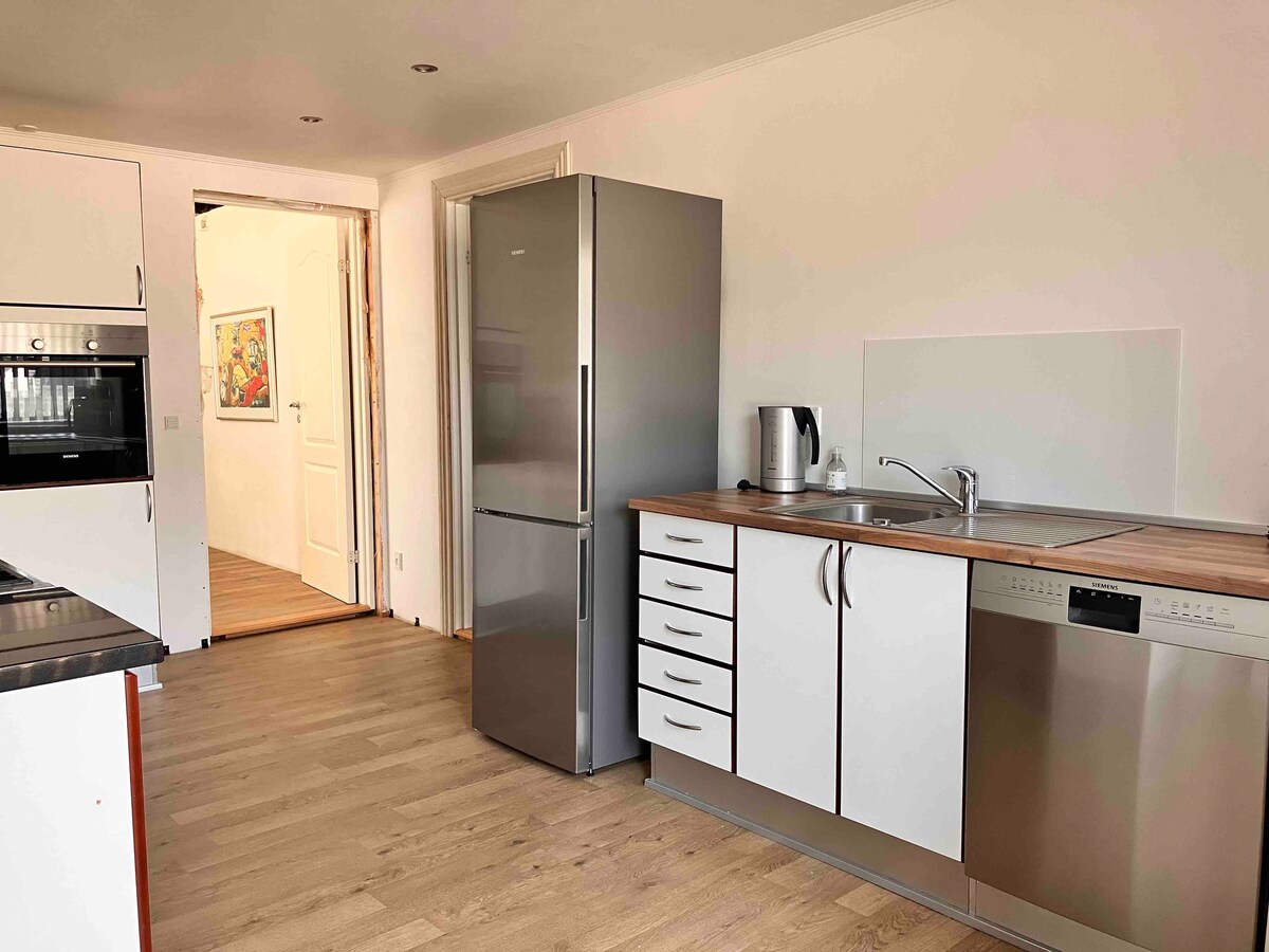 Appartement spacieux de 80 m² à seulement 5 min de la gare ferroviaire/routière de Vejle et de la rue piétonne. Comprend 1 chambre, un salon confortable, une cuisine entièrement équipée avec coin repas et une entrée privée avec espace pour poussette. Situé au 2ème étage d'une charmante maison. Parc et forêt à seulement 2 minutes. Parfait pour les familles, les couples ou les voyages d'affaires !