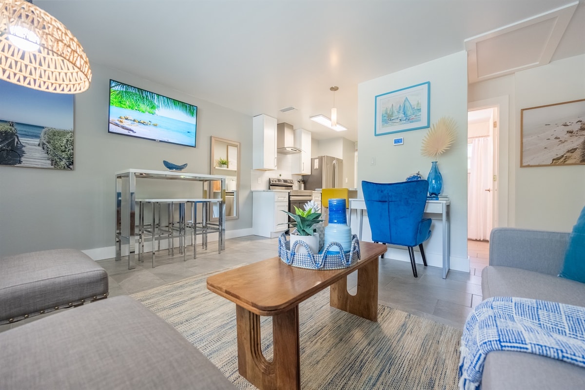 Cet appartement est situé au 2e étage avec des plafonds voûtés dans le séjour et un plan d'étage ouvert qui peut accueillir 2 personnes avec un maximum de 4 personnes. La literie de cette location est un lit King Size dans la chambre principale et un canapé-lit Queen Size. Cette location est idéale pour les séjours plus longs ou les voyageurs qui souhaitent cuisiner car vous disposez d'une cuisine complète et de tous les articles pour cuisiner n'importe quel repas. Il y a également un lave-linge/sèche-linge dans l'appartement privé pour votre usage. Les chaises de plage et les parasols vous sont fournis gratuitement.