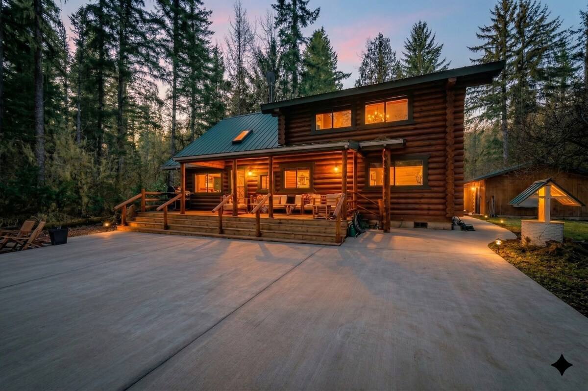 Évadez-vous dans la sérénité de cette cabane à l'architecture impressionnante sur la rivière. Trois chambres, deux salles de bain, une cuisine ouverte, un coin repas et un projecteur caché pour les projections nocturnes. Le jacuzzi donne sur la rivière et la cour spacieuse pour les loisirs. Barbecue pour cuisiner à l'extérieur. Pop-a-shot, ping-pong, cornhole et d'autres jeux sont disponibles dans le garage de jeu couvert pour s'amuser toute l'année. Juste à côté du terrain de camping de Verlot pour des promenades faciles, ou la randonnée plus impressionnante au lac 22. Maintenant avec Internet Starlink.