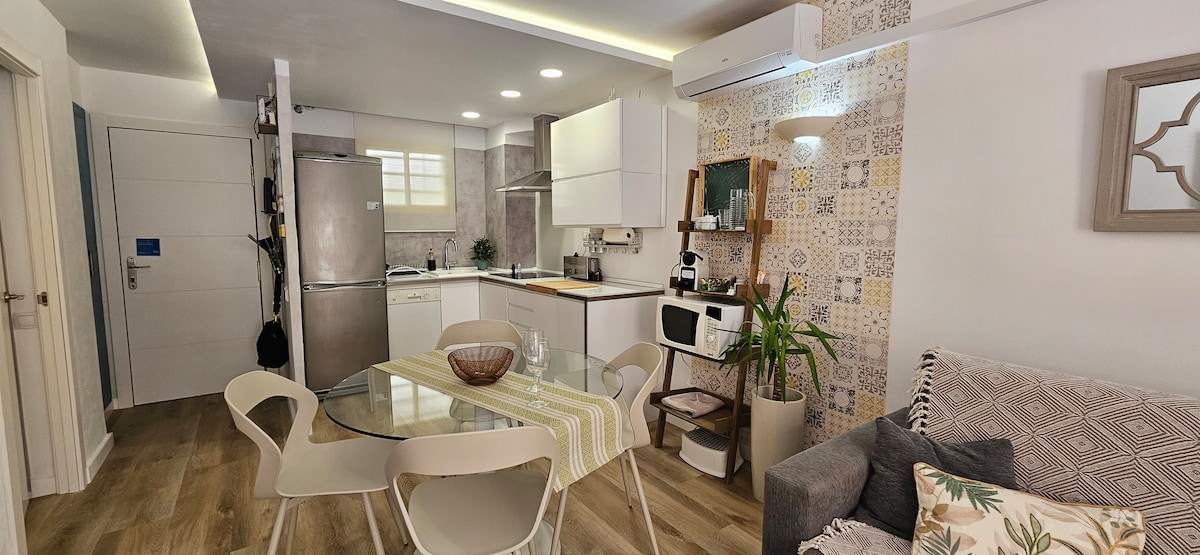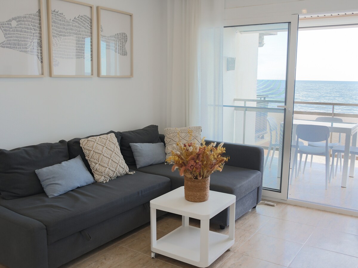 Appartement coquet et spectaculaire en première ligne de plage, avec une grande terrasse et une vue imprenable sur la mer. Situé au dernier étage d'une enceinte privée où il y a aussi un parking privé et une douche. Cuisine ouverte sur le salon entièrement équipée (induction, four, lave-vaisselle, grille-pain, machine à café Nespresso). Salon avec canapé-lit italien pour 2 personnes. Dans la chambre il y a un espace étude/travail. Climatisation/pompe à chaleur. Wifi. Smart TV. Stores sur toutes les fenêtres.