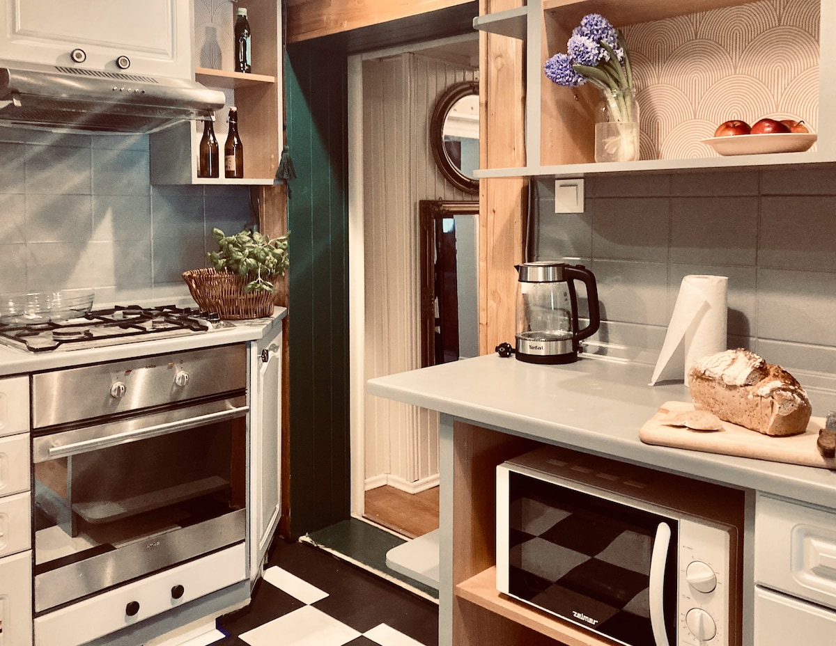 L'offre est un appartement de 45 m² avec de hauts plafonds, de grandes fenêtres et un chauffage au sol en béton. Le séjour comprend un canapé confortable, un coin repas et une grande cuisine, meublée avec des pièces en bois vintage et de nombreuses plantes. Il y a une chambre séparée avec un lit double (160x200cm) et un matelas supplémentaire (140x200cm) sur la mezzanine dans le séjour. La salle de bain spacieuse comprend une baignoire.