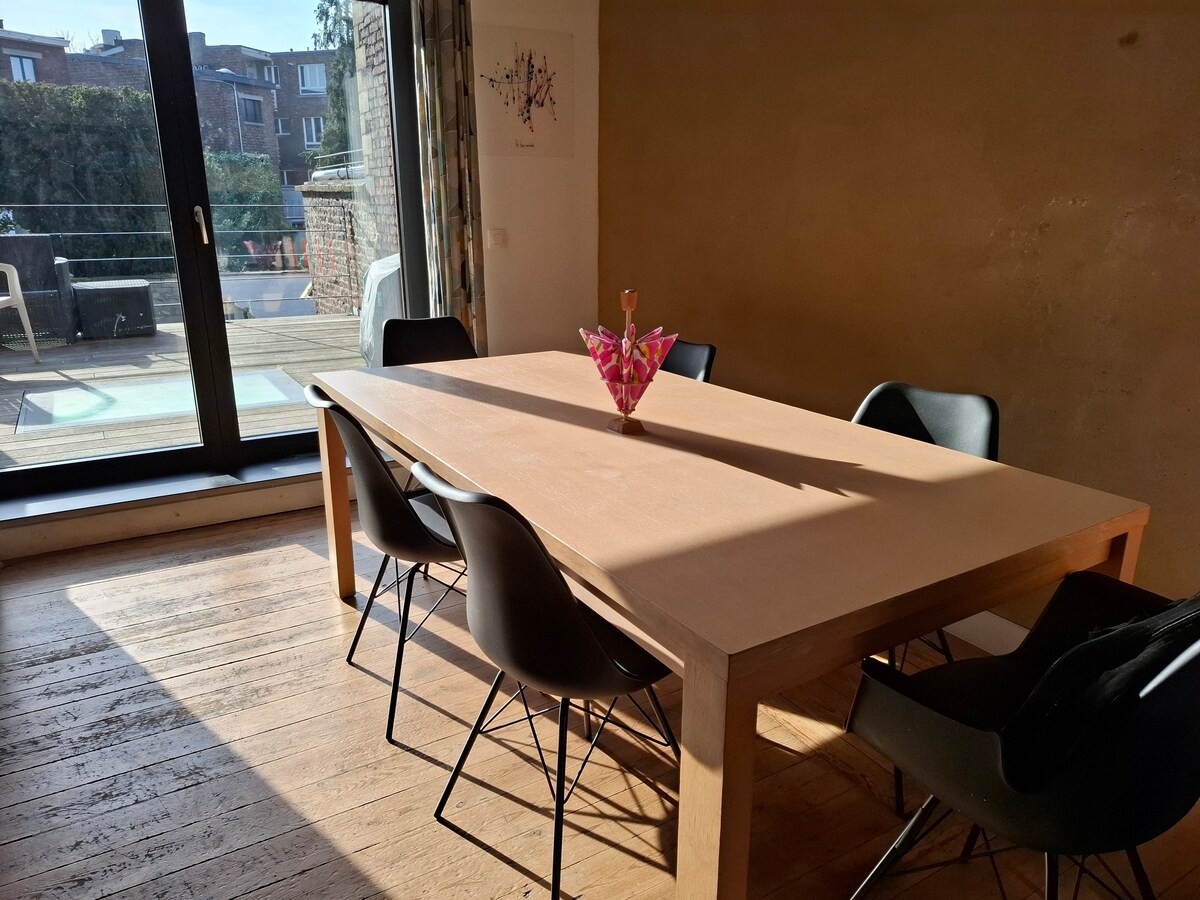 Petit logement cozy et full équipé jusqu'à 3 personnes (+ un bébé). Situé dans le village de Jehay à deux pas du château. Le tout situé dans une grande propriété (accès au jardin). Idéal pour un week-end de détente ou pour travailler au calme tout en étant proche des grands axes Wallons. Intérieur unique et chaleureux, matériaux nobles et belles finitions. Accès à un grand jardin et chien admis. Parking fermé et borne de recharge. Les draps de lit ne sont pas fournis.