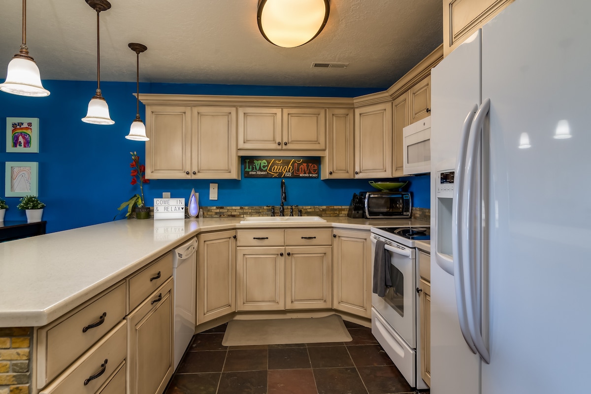Magnifique appartement à St. George ! 3 chambres et 3 salles de bain. Peut accueillir jusqu'à 10 voyageurs. Le balcon donne sur le jacuzzi et la piscine, ainsi que sur les terrains de basket-ball et de pickle ball. Des raquettes et des balles de pickleball, des ballons de basket et des jeux de société sont à votre disposition dans l'appartement. Nous aimons être au 3e étage pour la vue et parce que nous pouvons facilement ranger nos vélos sur le balcon. Il y a des pistes cyclables incroyables partout, avec un accès au sentier Bearclaw Poppy (notre préféré) juste en face !