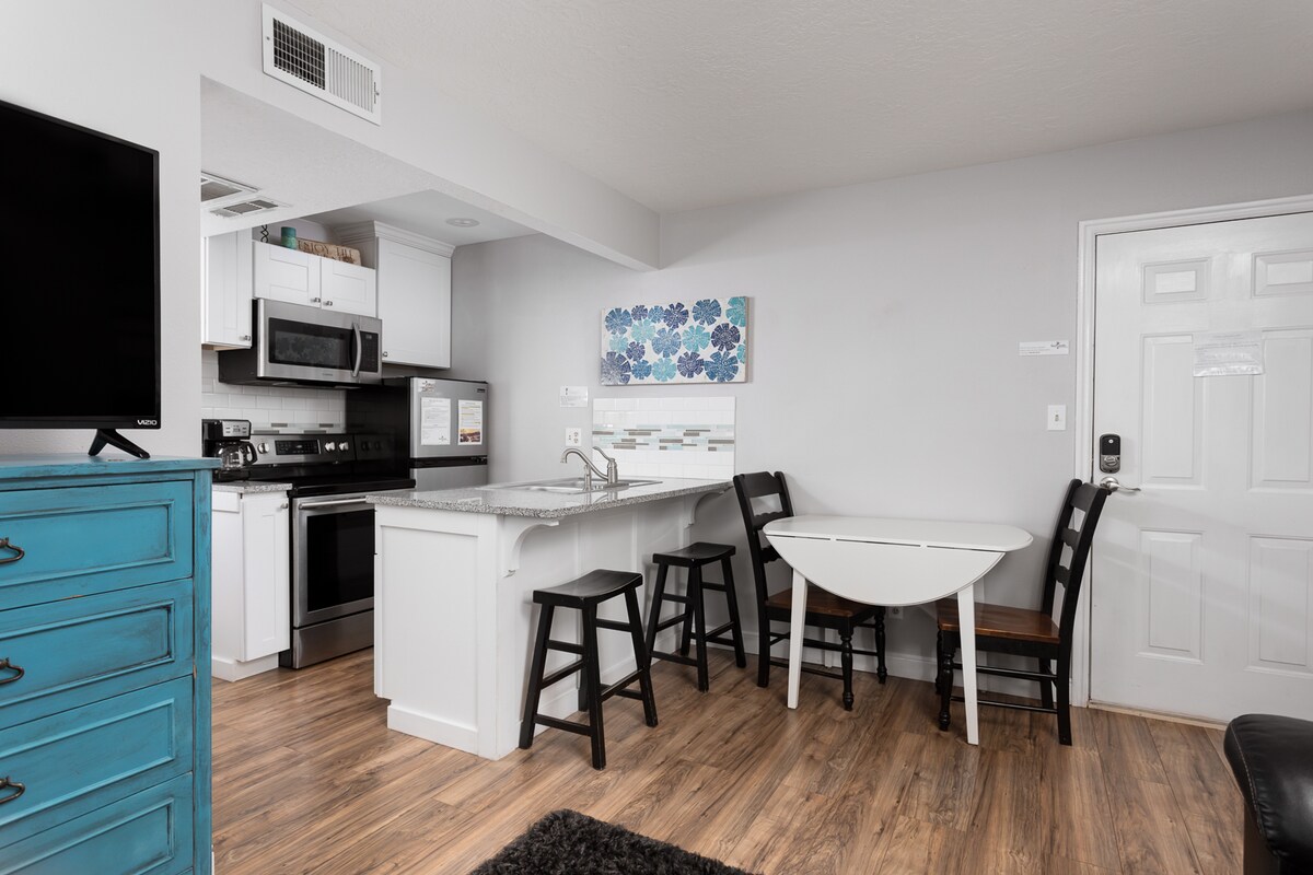 Le plaisir commence ici... Forfait Total Resort ! Plafond voûté, studio ensoleillé avec lit King Size (mousse à mémoire de forme), canapé-lit Queen Size en mousse à mémoire de forme, causeuse, cuisine complète avec tout ce dont vous avez besoin pour les repas faits maison, bureau, machine à glaçons, votre propre laveuse et sécheuse, votre propre terrasse privée avec table et sièges extérieurs, Wi-Fi privé, télévision intelligente, serviettes de piscine fournies. Parking gratuit et arrivée autonome. C'est le début de vos vacances parfaites.