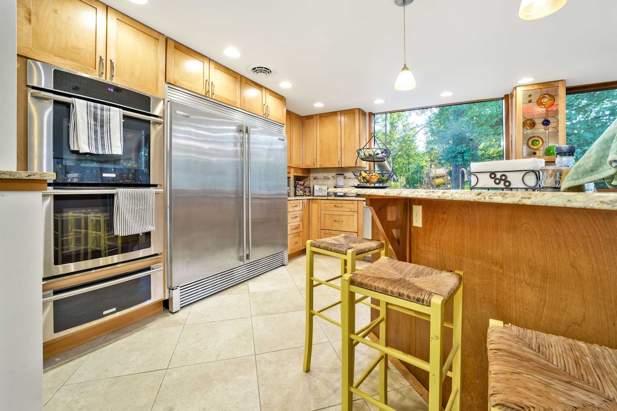 Bienvenue dans notre spacieuse et élégante retraite Airbnb moderne du milieu du siècle au cœur de Richmond, dans l'Indiana. Nichée sur un vaste domaine de 18 acres, cette maison de 3 000 pieds carrés est le mélange parfait de confort moderne et de beauté naturelle, ce qui en fait une destination idéale pour les groupes jusqu'à 14 personnes. Que vous profitiez d'une nuit confortable près de la cheminée dans le salon spacieux ou que vous organisiez un barbecue dans la cuisine d'été extérieure, cette propriété est conçue pour se détendre et se relaxer ! Terrain de pickleball !