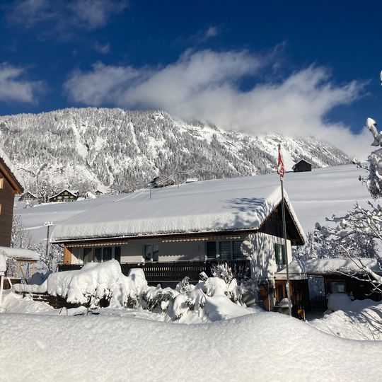 Au milieu de la nature avec une vue fabuleuse. La piste de ski de fond est juste autour de la maison. La remontée mécanique est à seulement quelques minutes. Cet appartement de 3,5 pièces (3-4 personnes) peut être loué. Le prix pour un appartement de 3,5 pièces avec terrasse est de 840 CHF pour 7 jours. Location également possible uniquement le week-end. Il dispose d'une grande chambre avec lit double (160 cm), une autre chambre avec un lit (140 cm), en plus un bon lit de voyage mobile. Un lit bébé est également disponible. Machine à laver/sèche-linge