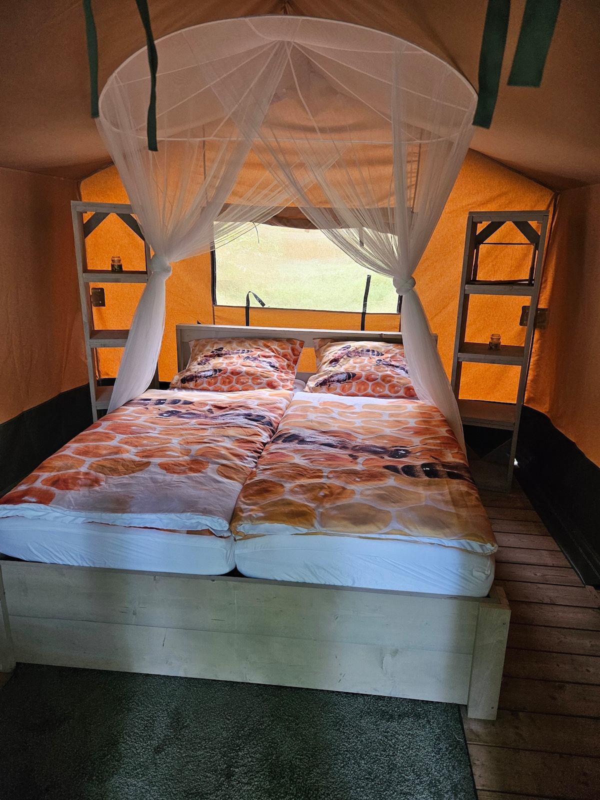 Glamping - Découvrez le charme particulier du camping sous tente avec beaucoup de nature et tout aussi beaucoup de confort sur notre centre équestre. Dans le jardin en forme de parc nous avons installé deux tentes exclusives de style safari. Nos tentes, Onguma-Lodge et Akwaaba-Lodge, offrent des zones de couchage séparées et séparées avec des lits confortables et une salle de douche, y compris des toilettes. La cuisine et le salon disposent d'une kitchenette somptueusement équipée, ainsi que de suffisamment d'espace dans la salle à manger.