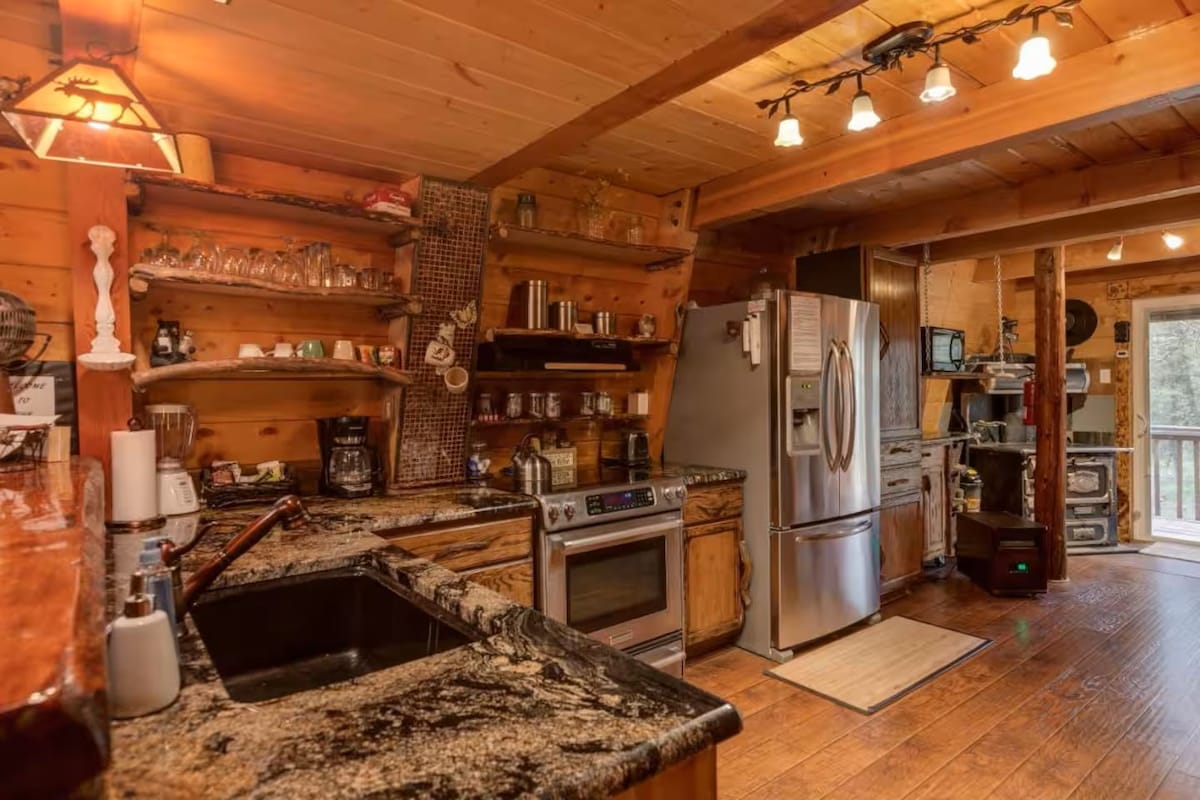 Notre cabane près de Yellowstone est entièrement équipée de toutes les commodités dont vous avez besoin pour un séjour confortable. Vous apprécierez la sensation rustique mais moderne qui provient des plafonds en bois et des garnitures, des meubles faits à la main et des plans de travail en granit. La cabane dispose de deux lits queen size, d'un lit King Size californien et de deux salles de bain complètes. Cette cabane est adaptée aux enfants et facilement accessible depuis l'autoroute 20. Il y a un grand parking et nous avons également accès à une rampe d'accès pour ceux qui ne peuvent pas utiliser les escaliers.