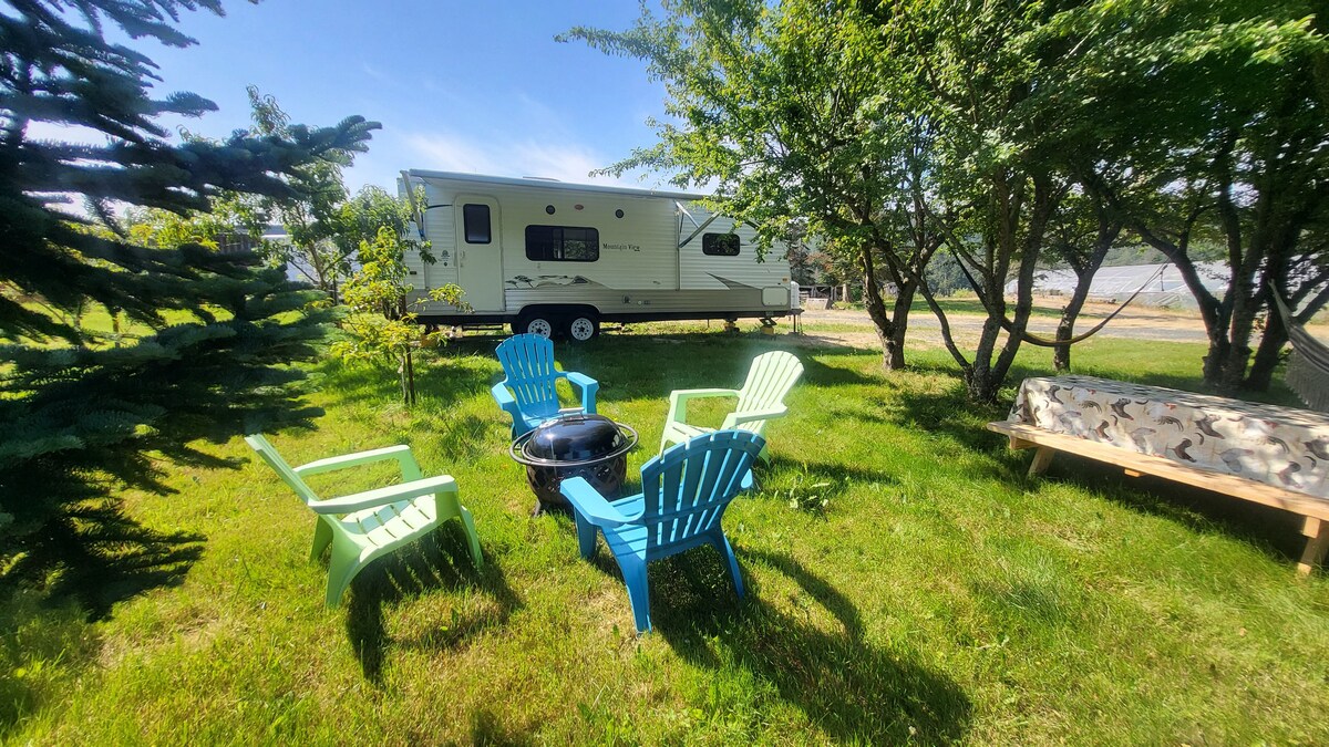 Remorque très propre, calme et confortable à l'arrière d'une propriété de 5 acres sur la Mount Baker Scenic Highway. Profitez de l'espace vert avec des fruits et des arbres matures juste devant la caravane, faites une sieste sur le hamac, asseyez-vous près de la cheminée ou faites un barbecue.