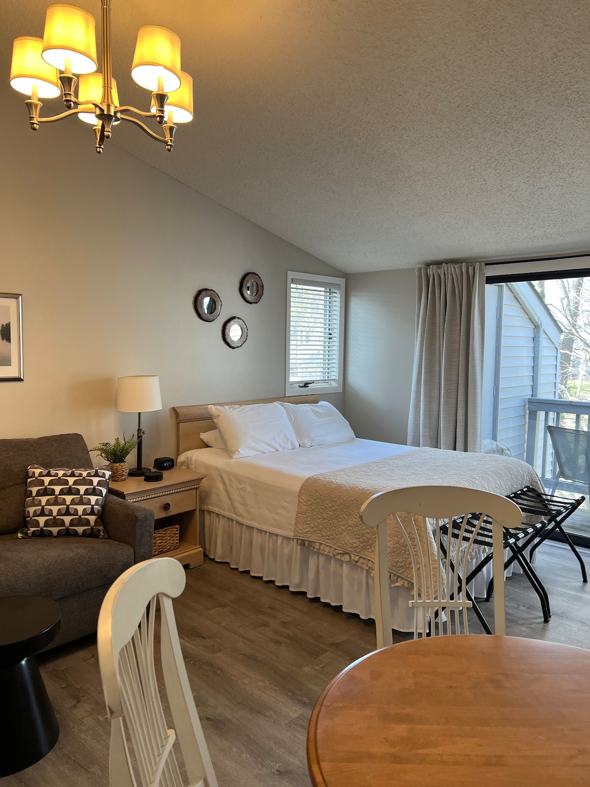 Entièrement rénové, y compris un nouveau lit Westin Heavenly, un canapé-lit, un bar à café/vin avec des lumières réglables. Ce qui n'a pas changé, c'est l'incroyable vue dégagée sur le coucher de soleil sur East Bay. À seulement 6 miles du centre-ville de TC, vous aurez l'impression d'être à des kilomètres du bruit et du chaos dans ce cadre tranquille. Des restaurants fabuleux sont à 2 à 10 minutes en voiture. Promenades panoramiques vers des villes artistiques pittoresques, des vignobles et des brasseries. Nous sommes situés au centre pour des excursions d'une journée à Leelanau, Glen Arbor et Sleeping Bear Dunes.