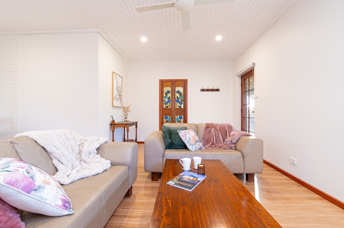Détendez-vous lors de notre belle escapade à McLaren Vale. Profitez des vignobles et des plages à proximité ou détendez-vous simplement avec la faune locale. Ce coin de paradis est équipé de la climatisation, d'une cheminée intérieure, d'une terrasse spacieuse, d'une cuisine entièrement équipée et de vélos. Profitez d'un panier de bienvenue composé de produits locaux pour le petit-déjeuner, d'un plateau de fromages, ainsi que d'une bouteille de vin ou de bulles. Avec le Willunga Basin Trail à votre porte et 8 vignobles à distance de marche, cette propriété offre vraiment la retraite parfaite.