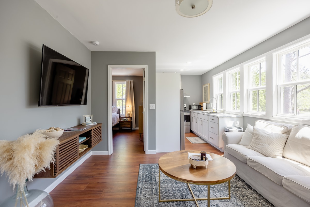 Détendez-vous et sentez-vous comme à la maison dans cet appartement de garage paisible et lumineux parmi les cimes des arbres. Idéalement situé à proximité du meilleur de Wilmington : à 10 minutes en voiture du centre-ville historique et à 15 minutes de Wrightsville Beach ! Bien aménagé avec un lit King Size confortable, de la place pour se détendre dans le séjour spacieux et une cuisine entièrement équipée pour tous vos besoins de cuisine ! Profitez de l'espace partagé de la cour arrière tandis que le stationnement dans l'allée et les hébergements dans la cime des arbres permettent une intimité totale. Faites comme chez vous !