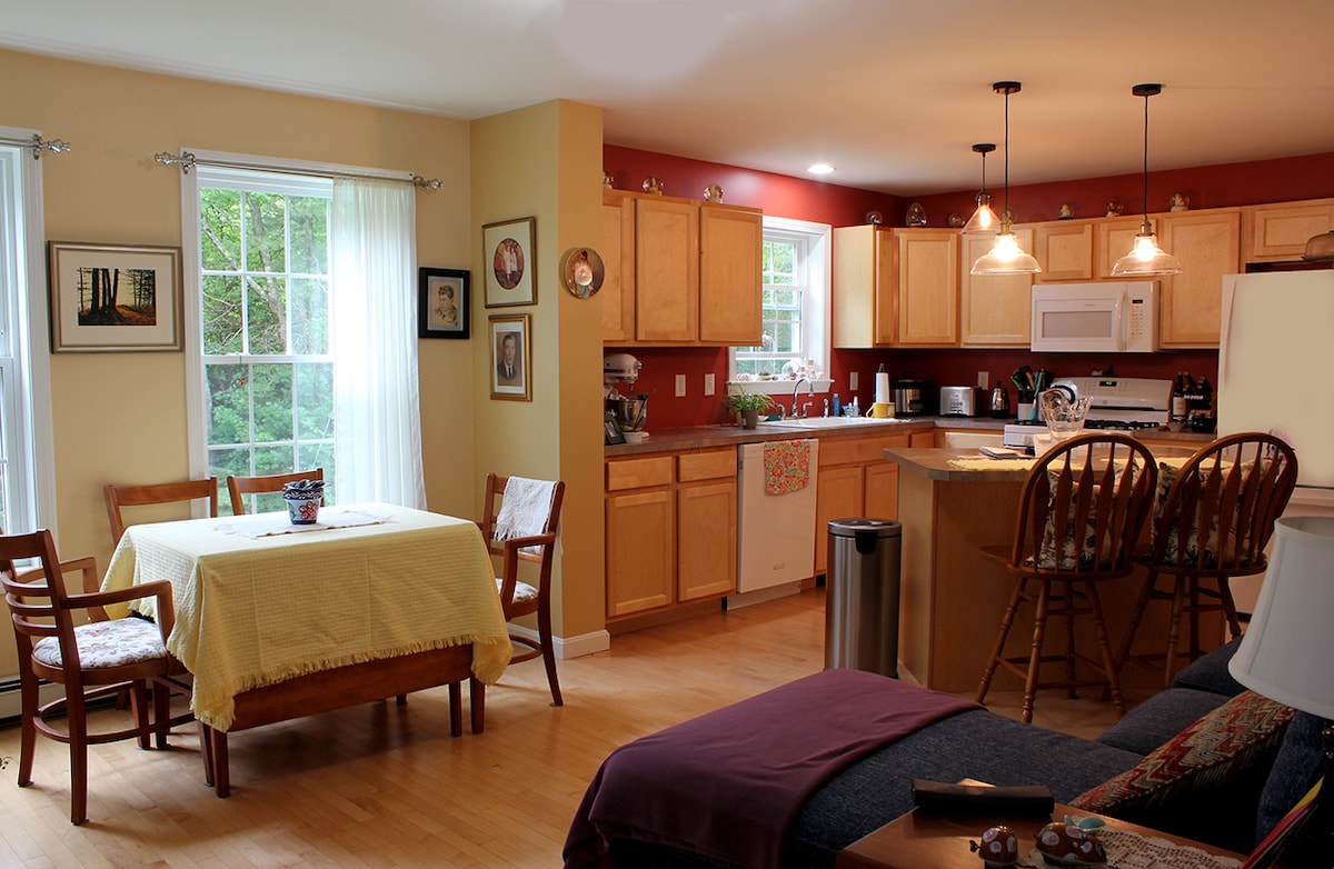 Situé dans un cadre magnifique bordant la rivière Ompompanoosuc, deux chambres avec loft, un mobilier simple mais confortable avec de belles œuvres d'art, des lits confortables, un porche et un poêle à bois en font le répit parfait du monde au rythme effréné. Situé au cœur des villages typiques de la Nouvelle-Angleterre adjacents (Thetford, South Strafford et Norwich), les restaurants à proximité, la campagne équestre et les activités cyclables font de cet endroit un joyau.