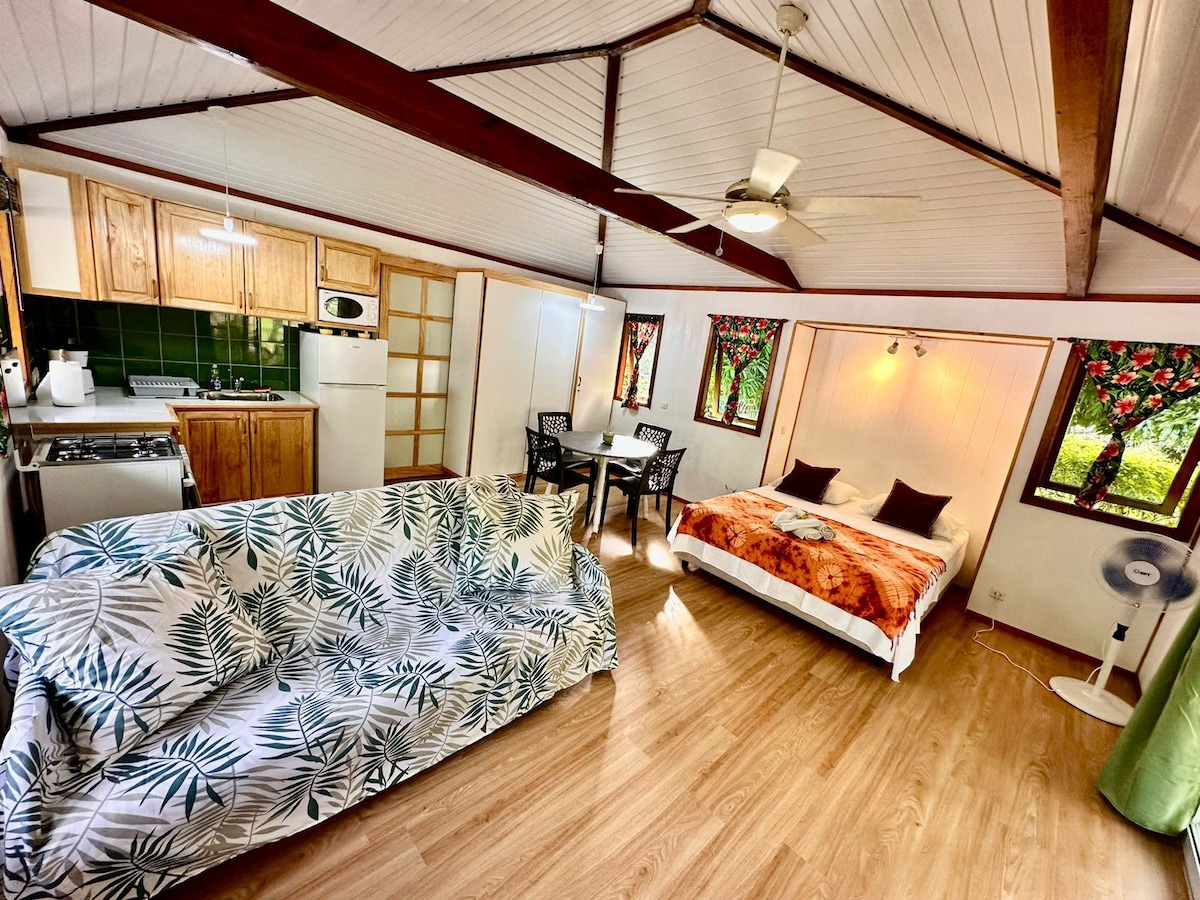 Bungalow duplex indépendant, bord de mer, situé dans une propriété privée. 1 chambre climatisée avec 1 grand lit 2 places + 1 canapé-lit. Un espace cuisine et salle de bain. Terrasse privative exterieure dans jardin bord de l'eau. 2 kayaks à disposition pour accéder au banc de sable à 100 mètres du faré et au spot de surf de Taapuna, à 800 m. Aéroport international /inter-îles à 10 minutes en voiture. Supermarché ouvert 24h/24 à 10 minutes à pieds. Restaurants, snack et roulottes à proximité.