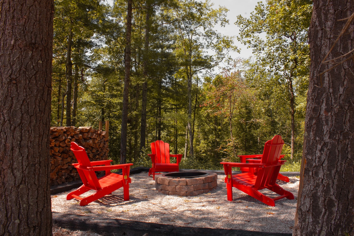12 acres de paix et de tranquillité à Campton. Vous pouvez vous promener sur les sentiers, vous détendre près du foyer ou simplement admirer la vue sur la forêt. Les soirées sont faites pour admirer les couchers de soleil sur le porche, observer les étoiles depuis le jacuzzi et écouter le chant des oiseaux. À l'intérieur, vous trouverez un Ms. Pac-Man vintage pour vous amuser un peu. Nous sommes à environ 15 miles de Red River Gorge, mais on a l'impression d'avoir tout l'endroit pour soi - pas de voisins proches, pas de circulation, juste des cieux sombres et des nuits étoilées.