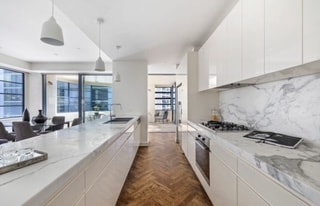 Magnifiquement conçue et stylée, cuisine/salon/salle à manger ouverte avec balcon panoramique face au nord-ouest, attirant le soleil toute l'année. 2 salles de bains superbes. Planchers blancs lavés partout, peints dans des couleurs neutres créant une atmosphère naturelle d'été détendue. L'éclairage d'ambiance met en valeur la vue nocturne/l'ambiance de l'appartement. Cuisine ultramoderne, banc en marbre, fabuleux bar à petit déjeuner. Vue panoramique sur la ville, Harbour Bridge, Sydney Harbour, Kings Cross, Potts Point.
