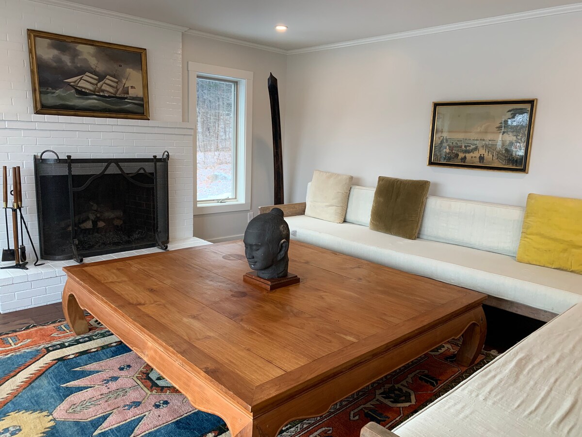 Annonce spectaculaire présentée par des Superhôtes chevronnés de Bath ! Profitez d'une vue imprenable sur la rivière Kennebec tout en vous blottissant près de la cheminée. Cette maison minimaliste remplie d'art moderne se trouve sur une falaise surplombant la rivière Kennebec et mène à la paisible réserve de Thorne Head de Bath, un vaste réseau de sentiers qui grimpent et longent la rivière. Elle est située à quelques minutes du centre-ville de Bath, la charmante ville historique des navires.