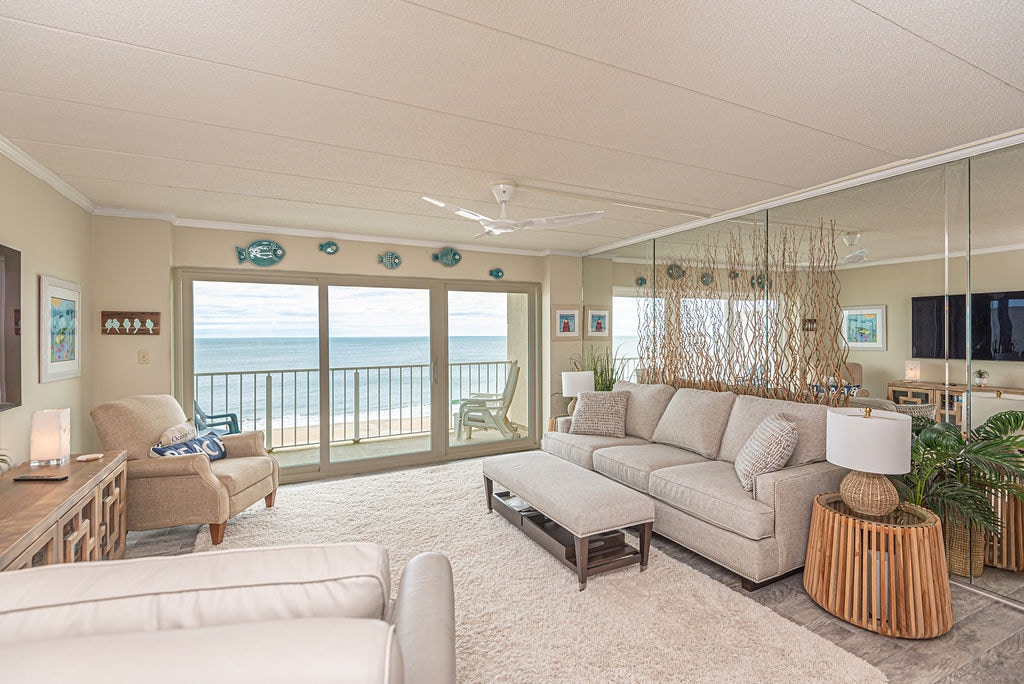 Magnifique condo rénové en bord de mer. Préparez-vous à vous détendre dans le confort et le style ! Ce grand 836 pieds carrés avec 1 chambre et 1,5 salles de bain offre une vue imprenable sur l'océan. Vous serez à quelques pas du sable dans l'un des bâtiments les plus proches de la plage. Profitez de votre café ou d'un lever de soleil différent chaque jour depuis votre balcon privé à côté du séjour. Mobilier de patio mis à jour avec un banc confortable et une table haute avec 2 chaises qui offrent une vue spectaculaire et complètement dégagée sur la plage et l'océan.