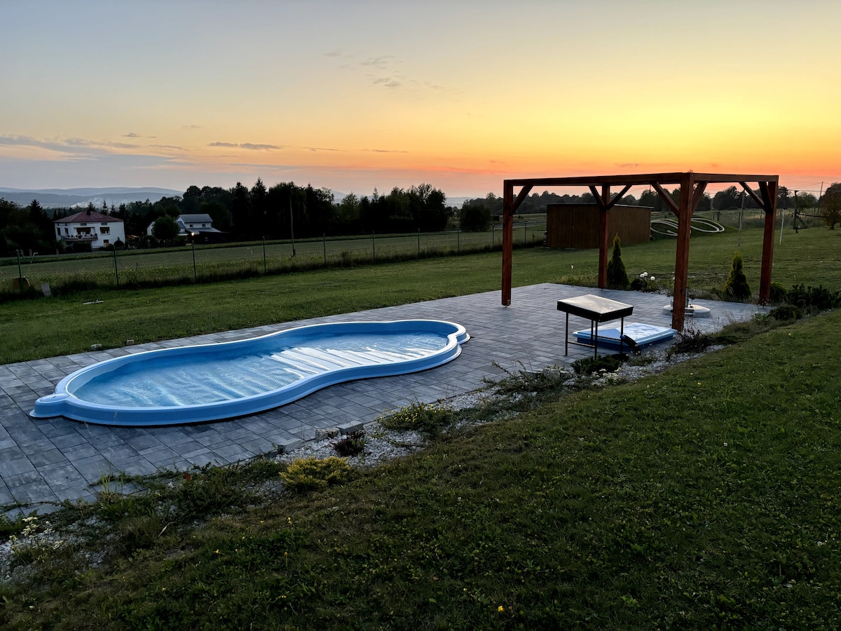 Une maison confortable avec piscine privée et jacuzzi, exclusivement pour un maximum de 15 personnes, située dans le village de Futoma (Matulnik), à 20 km de Rzeszów. Elle est proche de la réserve naturelle et de la piste cyclable. C'est l'endroit idéal pour une retraite en famille ou une escapade paisible entre amis, en pleine nature. La cuisine est entièrement équipée. Jacuzzi moyennant des frais supplémentaires. Le quartier est entouré de champs et de forêts, offrant la paix, le calme et le chant des oiseaux pendant la journée, et un ciel plein d'étoiles la nuit.