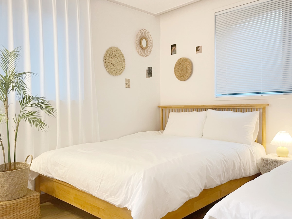 Gwanggyo Jungang Station / Parc Hosu adjacent Galerie commerciale, Lotte Outlet à 1 minute à pied Il s'agit d'un emplacement avec diverses commodités telles que Starbucks, Subway, CGV et Kyobo Book Centre dans le bâtiment. Il y a un bus pour Starfield juste devant la propriété. J'ai un grand intérêt pour le design d'intérieur, donc la literie, les meubles, Il n'y a pas de coins où je n'ai pas fait attention à l'éclairage, aux plantes et aux verres à vin. Literie : 3 couettes, 3 matelas, 6 oreillers 1 topper queen size pour le sol Canapé : canapé en tissu 3 places Jacomo Lit : matelas Zinus, cadre Ikea Malrum TV : 55 pouces Serif smart TV Appareils électroménagers : Ventilateur, aspirateur, sèche-cheveux, Nespresso, cuiseur à riz, port électrique, fer à repasser, humidificateur, déshumidificateur Commodités : Brosse à dents jetable/Dentifrice Mousse nettoyante Savon pour les mains Nettoyant pour le corps Shampooing Traitement Lotion pour le corps Crème pour les mains Ustensiles de cuisine : Casserole, poêle à frire, fourchette, fourchette pour enfants, couteau, assiettes, verres à vin, tasses, divers condiments, eau minérale Autres : livres/magazines, fournitures de premiers secours, jeux de société Les séjours de longue durée sont les bienvenus. 10% pour 7 jours et plus 15% par mois 20% de réduction pour 8 semaines ou plus.