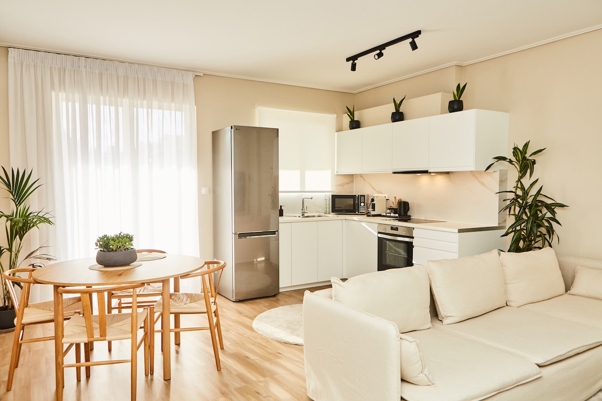 Un charmant appartement dispose d'un salon confortable, d'une chambre sereine et d'une cuisine entièrement équipée. Détendez-vous dans la salle de bain spacieuse après une journée d'exploration. Idéalement situé, il n'est qu'à un court trajet du centre historique d'Athènes et de belles plages. Profitez des commodités à proximité :supermarchés, cafés, boulangeries, restaurants, boutiques et parcs. Idéal pour les couples, les familles ou les voyageurs. Cet appartement allie confort,confort et charme local. Nous avons hâte de vous rencontrer !