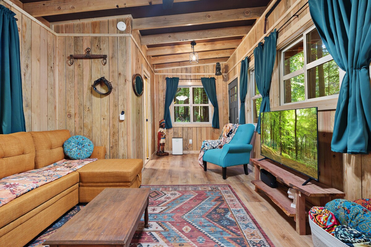 Chalet de micro-maison situé dans un jardin au milieu des séquoias, entouré de rhodies, d'érables, de bouleaux et de pommiers. Magnifique en toute saison. Le chalet est isolé en mousse et donc très calme pour une bonne nuit de sommeil. J'utilise un détergent sans parfum sur les draps. Le lit queen (3 couches de matelas en mousse à mémoire de forme haute densité) est dans un loft, accessible par une échelle de loft inclinée avec des découpes de poignée (ne convient pas aux bébés ou aux enfants). Nema 14-50 plug available.