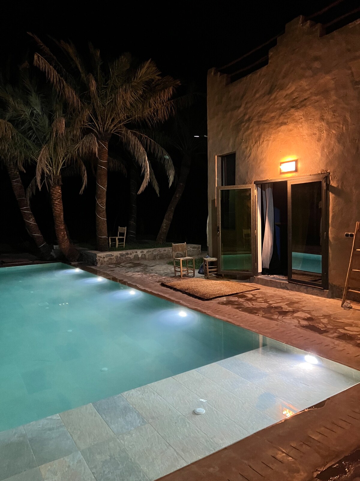 Situé au Maroc à 64km de Ouarzazate, au coeur de la vallée du Draa dans le village de Tamnougalt. La maison est cachée au milieu d'une cité de terre vieille de 400 ans et domine la plus grande palmeraie du monde…Séjour farniente, découverte du désert