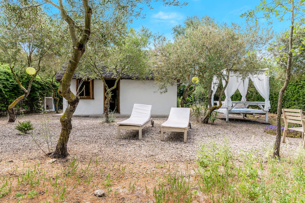 Magnifique hutte de paille à 300 m de la plage de Mangueta. Le toit est en paille naturelle et 100 % écologique. Le rez-de-chaussée de la cabane est distribué par une cuisine, un salon avec de hauts plafonds et donnant sur la terrasse, le jardin et une salle de bain de rêve avec des sols en pierre naturelle avec baignoire. Dans la partie supérieure se trouve la chambre mansardée, qui n'est pas très haute (1,60 au point le plus haut). La terrasse dispose d'une table et de chaises, d'un canapé de terrasse et de deux hamacs.