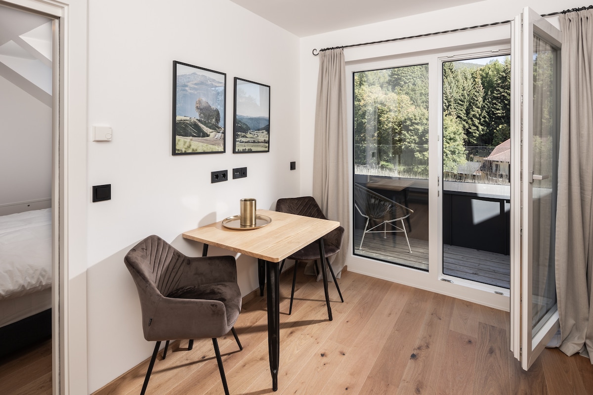 Notre maison d'hôtes « Burglodge Fischerkeusche » pour jusqu'à 35 personnes : dans l'appartement Corrie | 50 m² | profitez de la convivialité. Les fenêtres de l'appartement vont jusqu'au sol, donc tout l'appartement est inondé de lumière. En plus, vous avez une vue dégagée sur la montagne et vous voyez le château de Mauterndorf. Le balcon est équipé de sièges et d'une petite table pour profiter du paysage environnant. Le lit superposé dans la chambre des enfants est un rêve d'enfant devenu réalité.