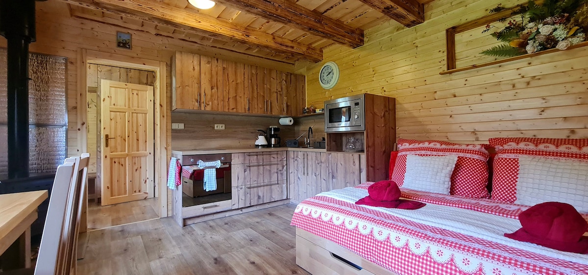 Petite maison confortable qui offre aux clients une intimité suffisante en étant située à un niveau de hauteur différent de notre jardin par rapport à notre maison. Disposition : Hall d’entrée avec salle de bain et toilettes, chambre avec lit double, table à manger, 2 chaises et télévision. Les clients peuvent également utiliser le kiosque de jardin avec cheminée, barbecue et salon. Il y a aussi une kitchenette équipée et un réfrigérateur (utilisable d’avril à novembre). Restaurant - 1 km, Épicerie - 1,5 km, Station de ski Obri Sud - 2 km, Areal Vesec - 2 km, Station de ski Jested - 5 km Eau, café, thé - gratuit