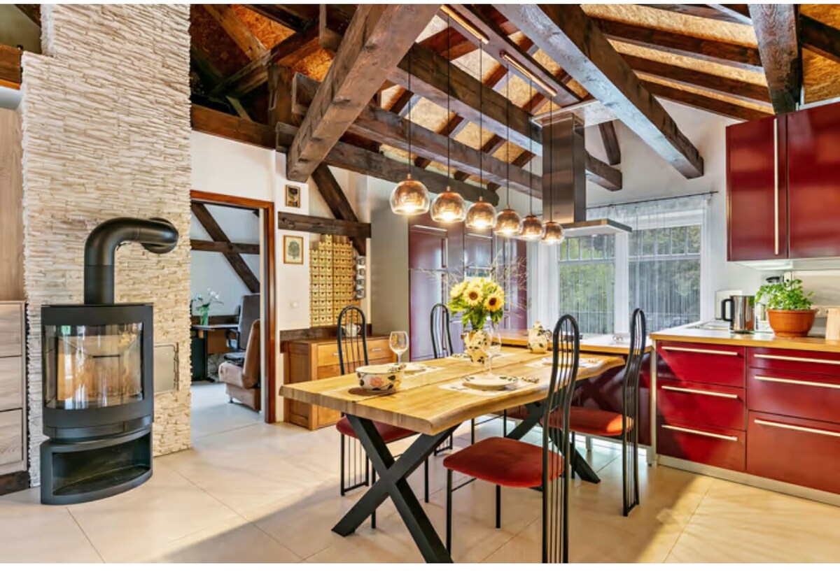 Détends-toi dans ce logement calme et élégant sous le toit. Rassemblez de nouvelles forces pendant une pause et trouvez-vous. Profite d'une promenade à travers la forêt adjacente ou au lac Müggelsee de Berlin, à seulement 4 km. Distances : 5 minutes à pied du tram, 10 minutes du S-Bahn Berlin-Friedrichshagen, 30 minutes de Berlin-Mitte, 1 minute de la forêt, 5 minutes de la boulangerie et de la manufacture de glaces bio