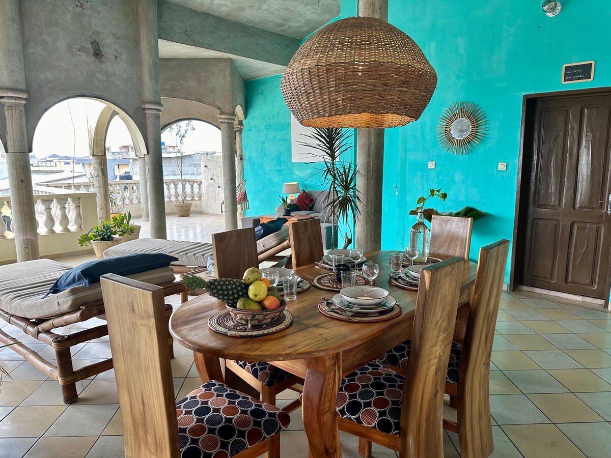 Duplex lumineux de 3 chambres avec cour privée - 15 mn à pied de la plage de Fidjrossè (3 mn en voiture) - 15 mn en voiture l’aéroport de Cotonou - Proches de toute commodité (Supermarché, restaurants …) - Accès facile à la ville de Ouidah par la route des pêches - Possibilité d’accueillir 6 personnes maximum - Service de ménage / Gardiennage en soirée - Equipé, confort et intimité. - Relation directe avec la propriétaire soucieuse de rendre votre séjour aussi agréable que possible